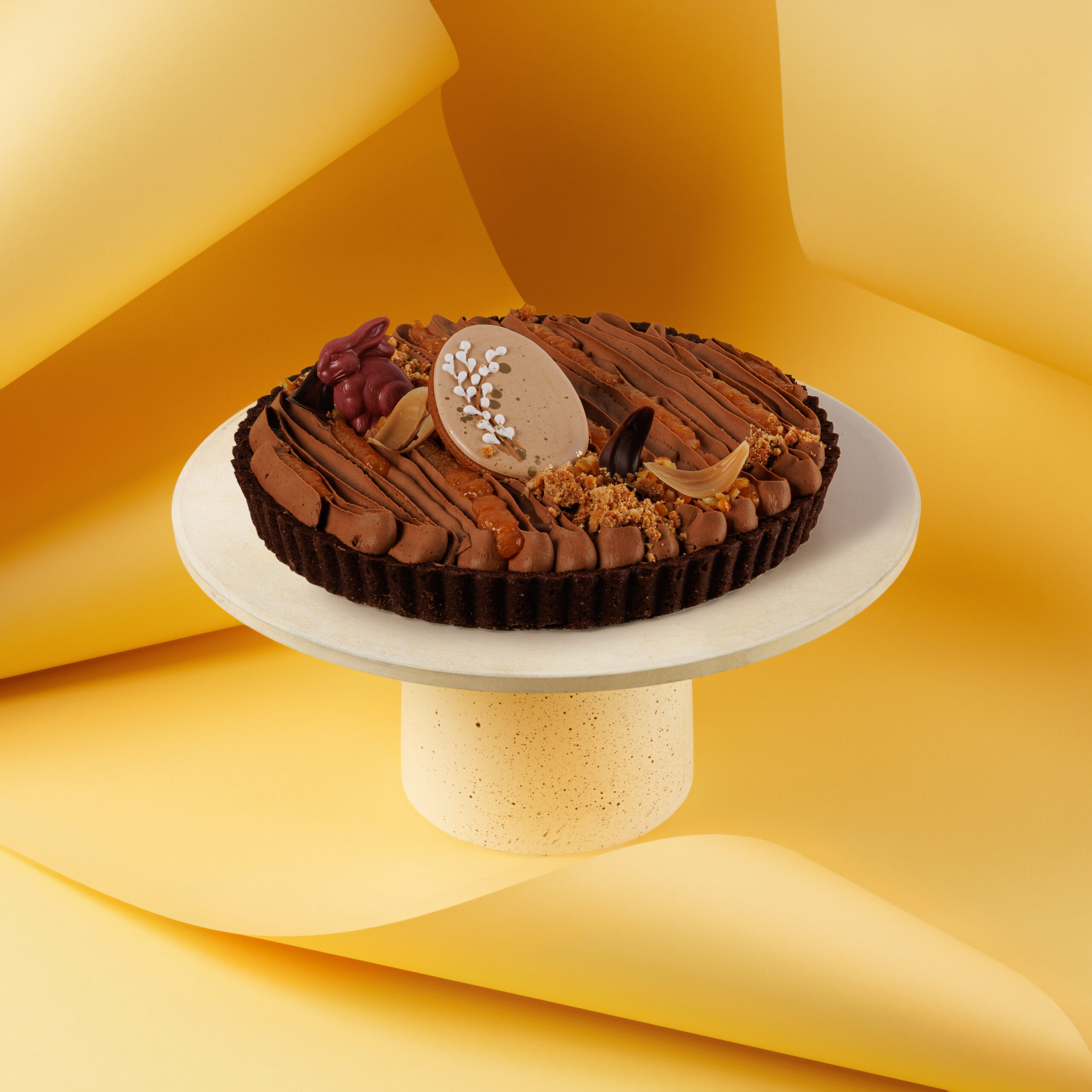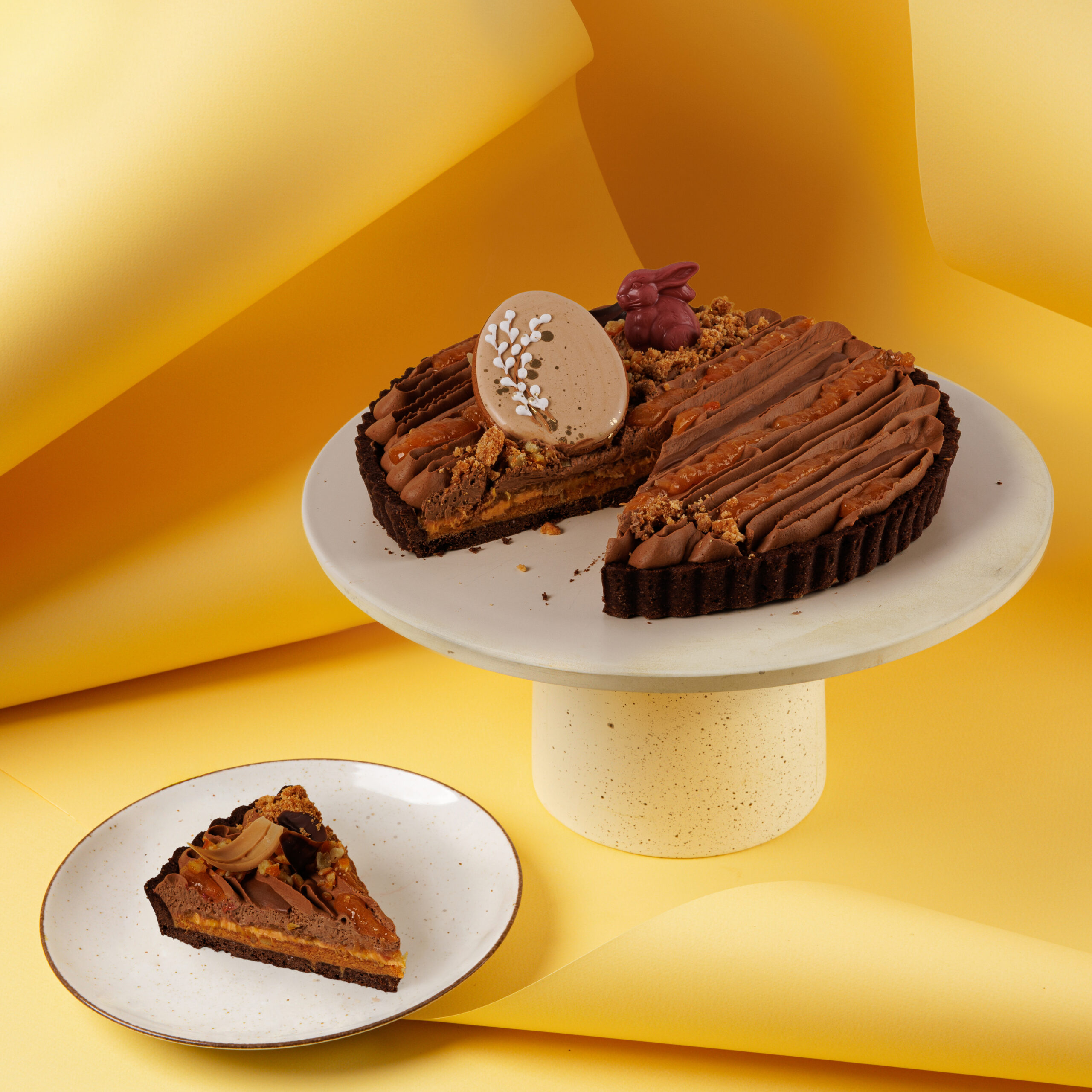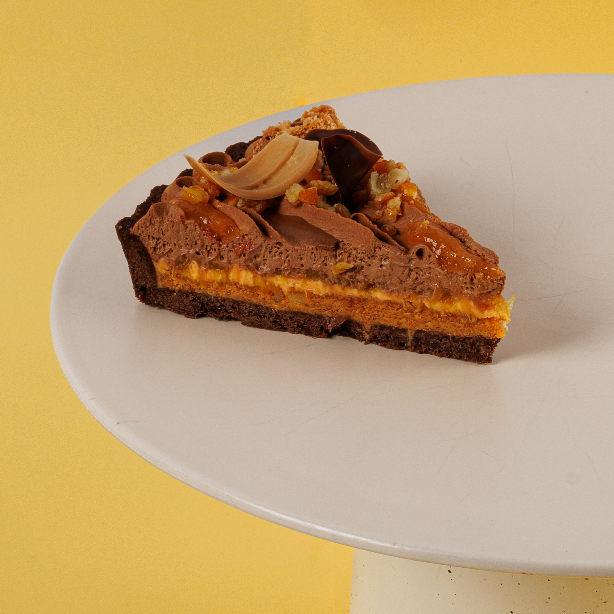 Mazurek czekoladowo – pomarańczowy na czekoladowym kruchym spodzie, przełożony konfiturą z pomarańczy, z chrupiącą prażynką czekoladowo – pomarańczową, wykończony kremem czekoladowy z likierem cointreau %