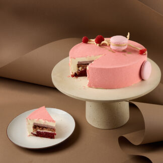 Wiśnie wnoszą soczystość i wytrawny akcent, perfekcyjnie przełamując słodycz. Całość wykańcza delikatny połysk i równe krawędzie, dzięki czemu tort prezentuje się wyjątkowo elegancko. To klasyka w wersji premium – wyważona, wielowarstwowa i zapamiętywalna.